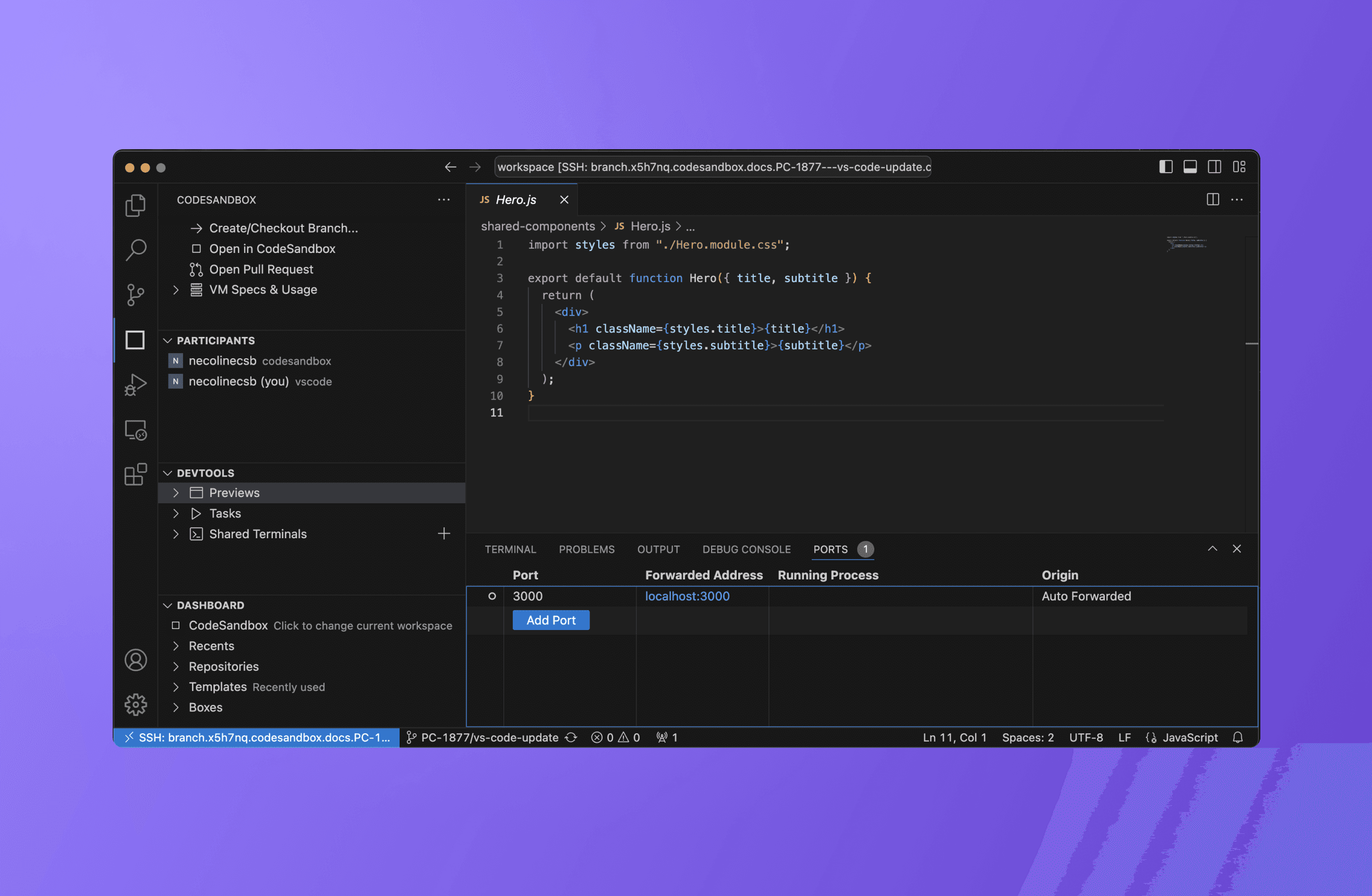 Just like in the CodeSandbox editor, you can access running ports to view code changes in the browser. The available ports are listed in the panel. Clicking on a port will open a tab in your default browser.
